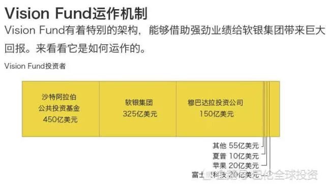 愿景基金背后是一个小规模投资者群体,合计出资1030亿美元。包括来自沙特阿拉伯公共投资基金的450亿美元和来自阿布扎比的穆巴达拉投资公司的150亿美元。规模较小的投资者包括富士康科技(2354,台湾)、苹果(AAPL)、高通(QCOM)及夏普(6753,日本)。软银自己出资325亿美元。