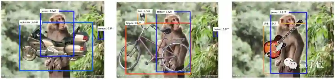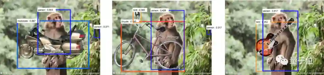 而且,神经网络对场景的变化也过于敏感。比如下面的这张图,在猴子图片上放了吉他等物体,神经网络就将猴子识别成了人类,吉他识别成了鸟类。