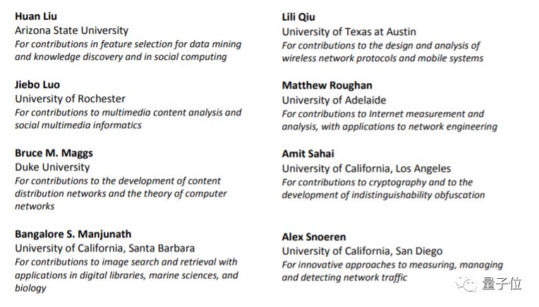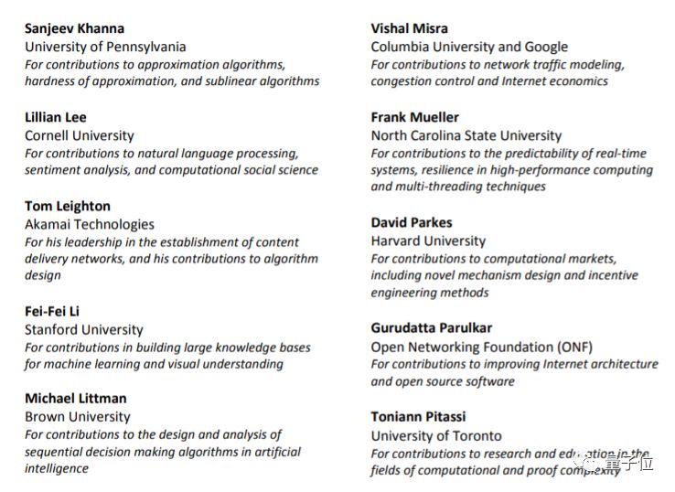 下面是全部入选者名单,他们来自芬兰,希腊,以色列,瑞典,瑞士和美国的高校、企业和研究中心,主要贡献在于可访问性、AR、算法博弈论、数据挖掘、存储、软件和万维网等领域。