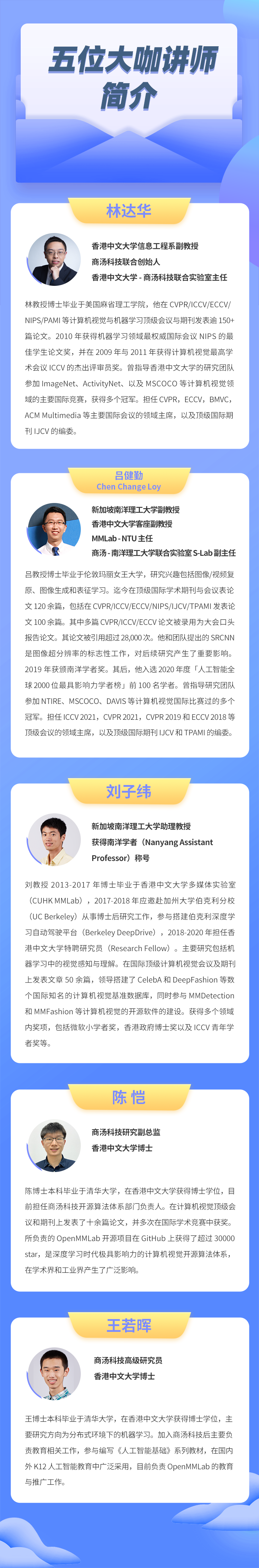 届时,多位在计算机视觉领域享誉海外,来自世界顶尖高校和企业的老师和教授,将逐一详解图像分类、目标检测、语义分割、底层视觉、视频理解等计算机视觉最核心、最基础的技术方向,并基于OpenMMLab的一系列工具,提供算法模型从理论到实践的指导。