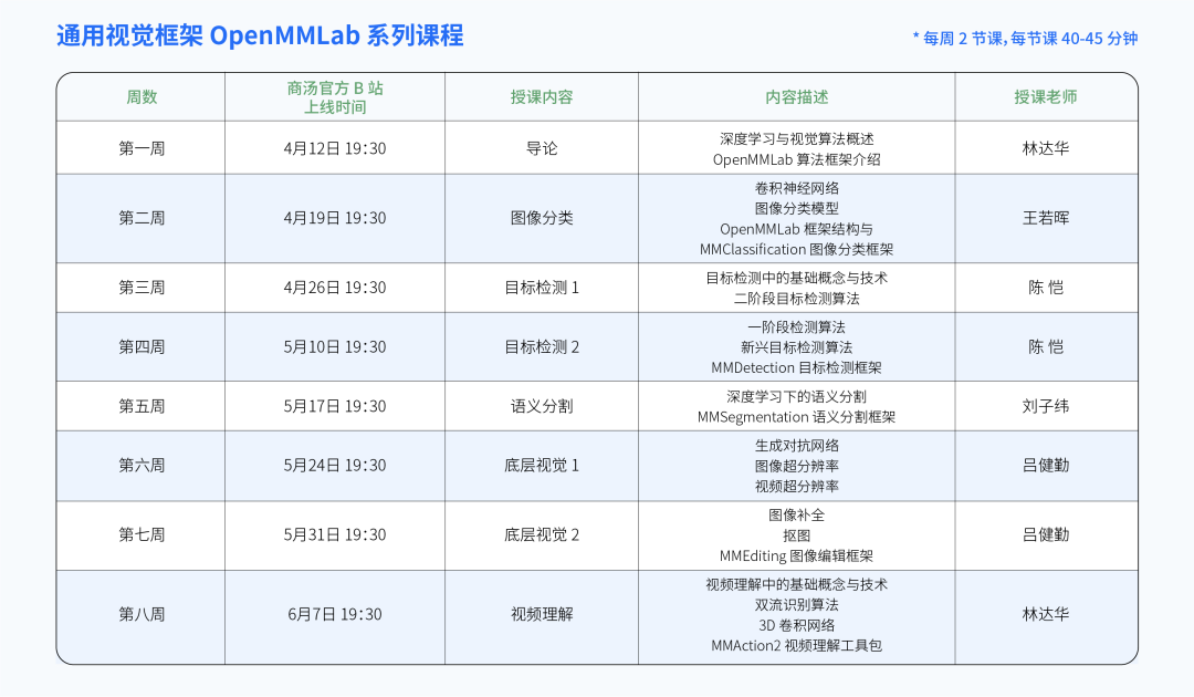 OpenMMLab受邀讲授算法实践课程——《通用视觉框架OpenMMLab》系列课程,共8周16节课时。