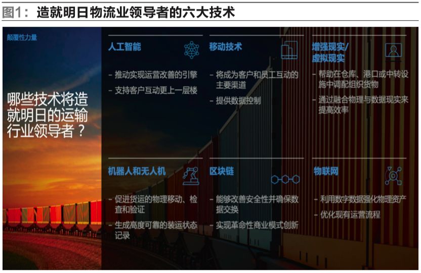 我们在之前的文章当中讨论过:面对新的市场、新的竞争者和买方新的需求,我们认为人工智能、移动技术、虚拟/增强现实、机器人/无人机、区块链和物联网的有效应用,将会极大地为物流业赋能,提升物流企业的竞争。并帮助物流企业在新一轮变革中,赢得市场、降低运营成本和大幅提升运营质量。
