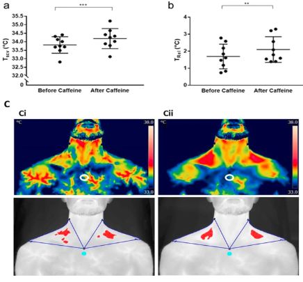 另一方面,研究人员利用非侵入性热成像技术,追踪了引用咖啡后人体棕色脂肪的激活及产热状态。他们发现,与喝水的对照组不同,饮用咖啡的研究对象锁骨上区域体温显著升高,而该区域是人体棕色脂肪的主要分布区域,这就意味着喝咖啡后,棕色脂肪被有效激活,并且开始了产热进程。也就是说,咖啡可以通过激活棕色脂肪实现减肥!