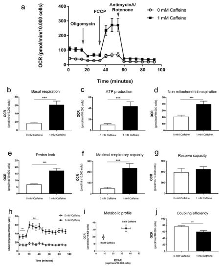 研究人员将干细胞衍生的脂肪细胞暴露于咖啡因,发现UCP1的含量明显增加,细胞基础呼吸增强,耗氧量增多,代谢加速。同时,咖啡因还增加了糖酵解和氧化磷酸化,上调了棕色脂肪组织相关基因的表达,极大刺激了棕色脂肪组织的活性。