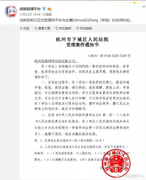 【TechWeb】11月24日消息,昨晚,战旗直播在官微发布消息称,已就合同纠纷起诉前主播EdmundDZhang(张驰),法院已经受理,并附上了法院受理的通知书。