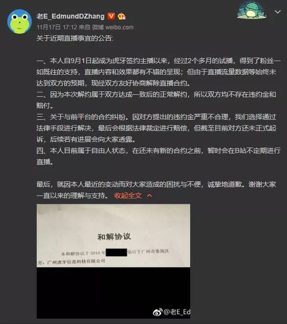 11月17日,EdmundDZhang更新微博,称其在虎牙的直播流量数据等始终未达到双方的预期,双方已友好协商解除直播合约。关于与前平台(战旗)的合约纠纷,因对战旗提出的违约金严重不合理,他选择通过法律手段进行解决,最后会根据法律裁定进行赔偿。