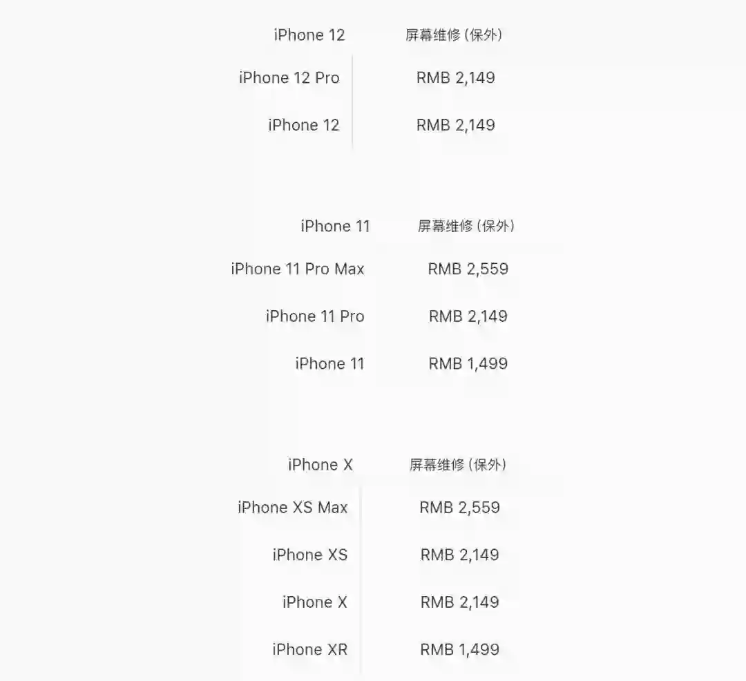 目前,iPhone 12 和 iPhone 12 Pro 的官方屏幕维修费用已经在官网公布。iPhone 12 和 iPhone 12 Pro 均采用了 Super Retina XDR 屏幕,因此维修价格与 iPhone 11 Pro 一样,均为 2149 元。而 iPhone 12 mini 以及 iPhone 12 Pro Max 仍未上市,因此维修价格未公布。