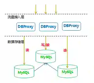 当前百度 MySQL 提供的架构为三层架构,业务方面使用的是 BGW 方式以及内部的 BNS 服务,中间层为自研中间层的代理,最底层为 MySQL 集群服务。如下图所示。