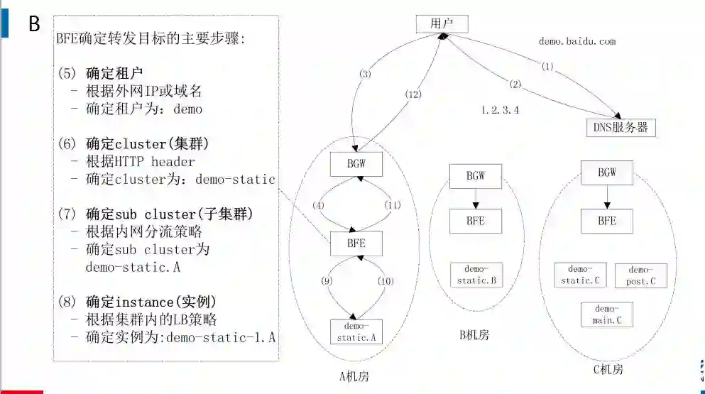 如下图所示为 BFE 基础转发的步骤。用户解析域名,当达到第三步时,可以拿到 IP 地址请求四层网关 BW,BW 会把流量转到 BFE。左侧是 BFE 四步要做的工作,首先根据外网的 IP 或者运营确定租户,第二步确定它属于哪一个集群,第三步是 BFE 要确定它属于哪一个子集群,可以看这右图,三个椭圆表示三个不同的 IDC,最后确定把这个流量打到哪一个实例。