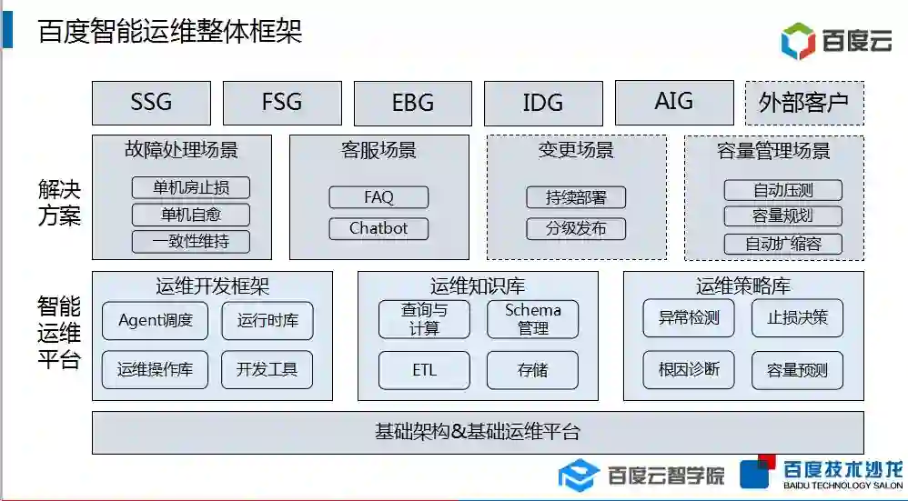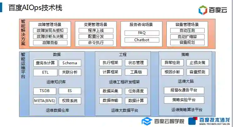 下图为百度智能运维整体框架图。最下方是基础运维平台,提供最基本的运维能力,在此平台的基础上构建运维开发框架、运维知识库和运维策略库,在面临不同的场景和不同的业务将所有场景的算法抽样出来提供服务。