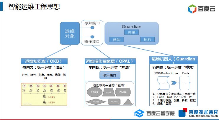 首先,为了解决不同业务线对运维对象的定义、操作接口、运维模式差异化的问题,百度提出了指导智能运维的三个原则: