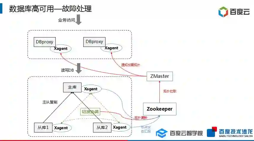 当在前面的识别阶段感知到做的主从切换的时候,百度会在代理层把主库完全替换掉,这个问题在一定程度解决切换的过程中出现主库重新写的问题。接下来就是选择主库的过程,当真正拓扑完成后,会将完成信息通过网通节点发送至代理节点。这一选取新主库的过程,就是进行故障处理的过程。