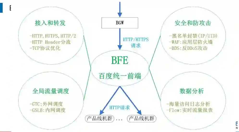 百度统一前端 BFE 分为四个版块,上游是四层的网关 BEW,下面作为七层的转发网关具有七大功能,第一是转发,包括多种协议,除了最基本的 HTTP,HTTPS,还有 HTTP2。第二是流量调度,一个是外部还有一个内网。第三是安全和反攻击。第四个是海量访问日志分析与做实时流量报表。