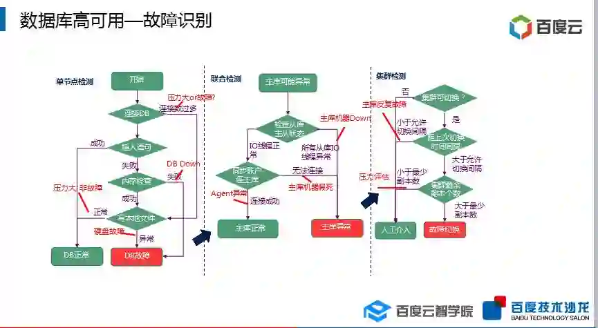 结合完整数据库内部识别故障。首先收集节点信息以及状态,查看连接数,判断是否是由于 MySQL 实例自身的压力问题或其他问题导致感知到 DB 有异常的状态,进而上升到联合从库的信息检测当前的主库是不是正常。检测感知异常是否是由于假死或压力过大,然后上升集群内部的联合诊治机制。最终上升到整体数据库 APP 检测机制,以此来决策到底要进行怎样的切换。同时,在切换时要考虑主从之间延时的问题。基于前面的感知,以及识别,做真正的故障处理。
