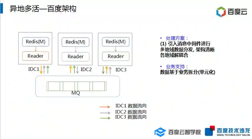 随着业务发展,百度需要将服务部署至多个地域,同时要求数据一致。为了满足这个需求,百度提出了主地域的概念,所有数据写到主地域,其他从地域通过 Redis 自带的复制功能实现同步,这样就实现了不同地域间的数据同步。同时考虑到多地域之间数据主机房出现故障能够止损自愈,百度对整机房切换方案进行了支持。另外由于考虑到服务有可能不断扩容的需求,实现了在线扩容。