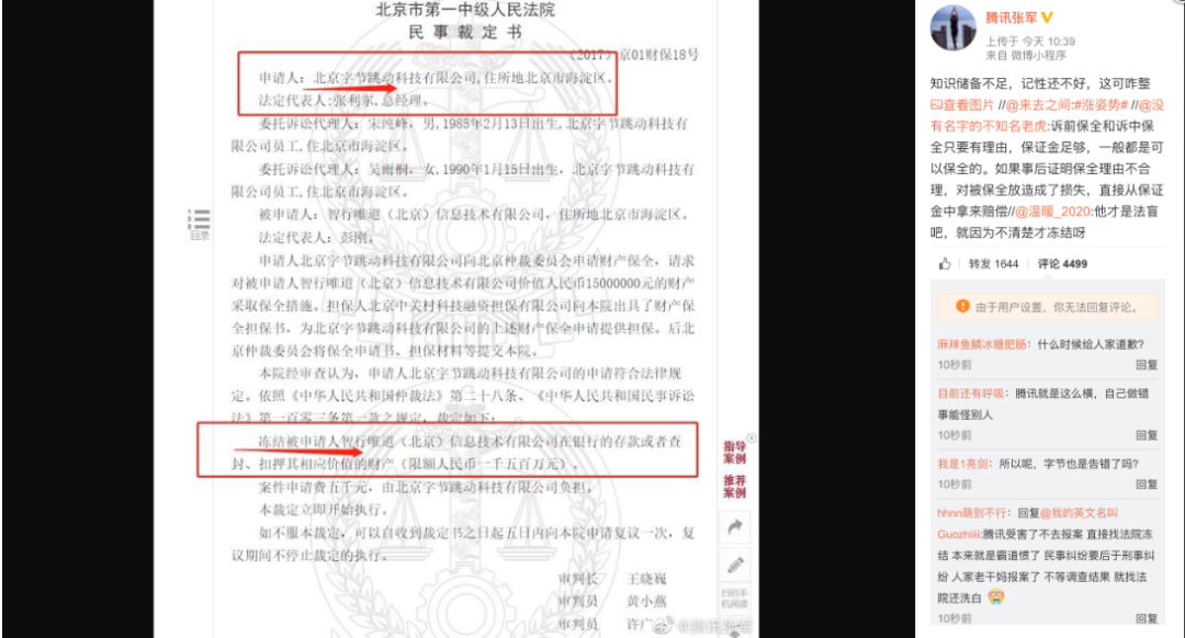 腾讯公关总监张军也在微博上对字节跳动副总裁的这番言论进行「回击」,称:「知识储备不足,记性还不好,这可咋整 」,同时还晒出字节跳动此前对某企业申请财产保全冻结的民事判定书。