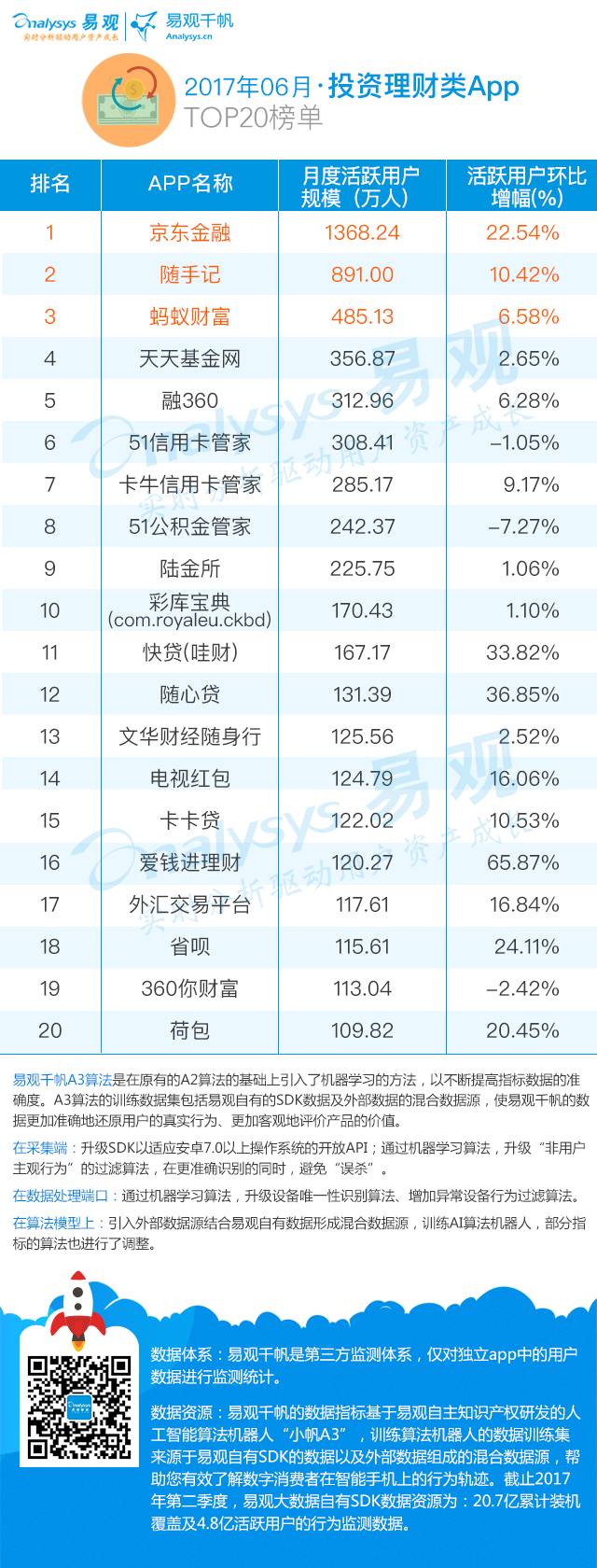 京东金融 App通过不断加载金融科技前沿功能和不断丰富生活场景,活跃用户规模实现稳步增长,居于投资理财领域之首位,并在6月实现22.54%的环比增幅。