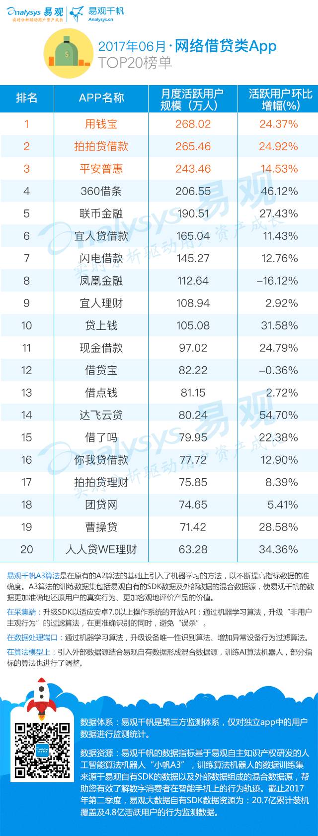 网络借贷整体用户规模不大且用户相对分散,缺少头部应用,目前仅有用钱宝、拍拍贷借款、平安普惠和360借条等4个应用活跃用户超200万人,但另一方面,活跃用户规模前7的应用在今年6月均实现了10%以上的环比增幅。