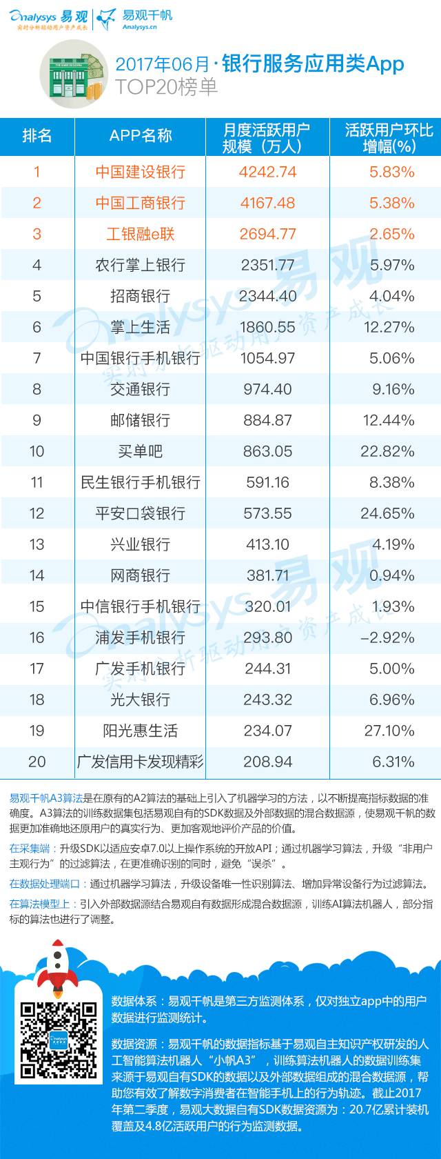 在2017年6月银行服务应用App榜单中,中国建设银行、中国工商银行、工银融e联分别以4242.74万、4167.48万和2694.77万的活跃用户规模位列前三甲。