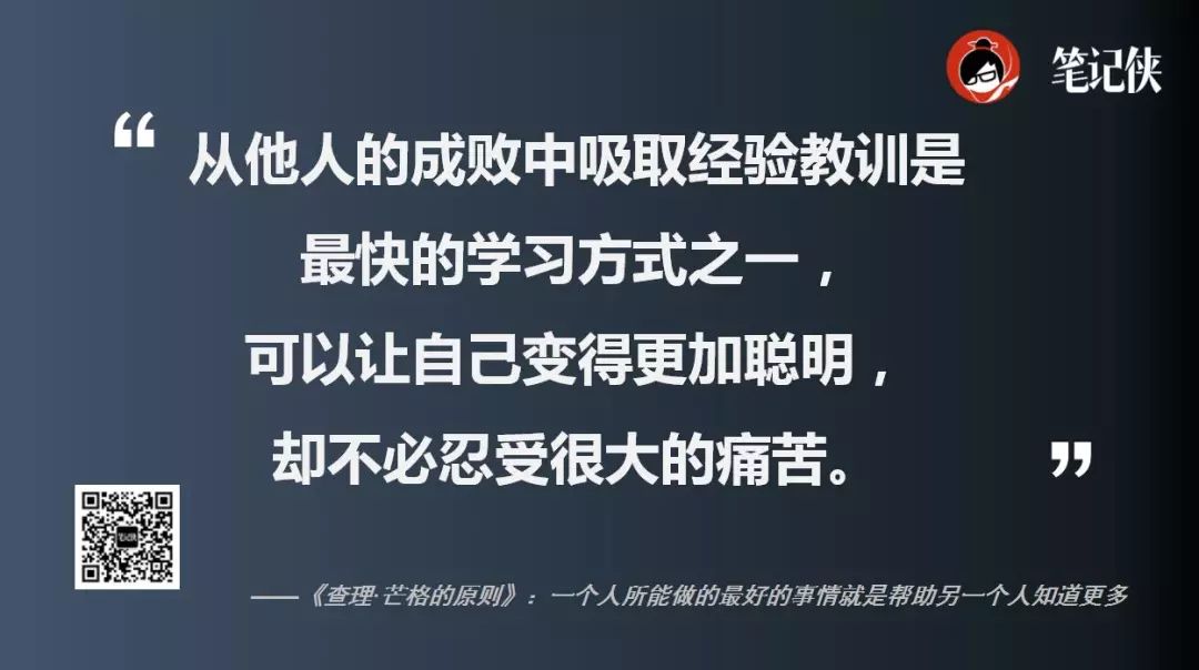 同样的方法也可以解释芒格为什么会阅读数百部人物传记。从他人的成败中吸取经验教训是最快的学习方式之一,可以让自己变得更加聪明,却不必忍受很大的痛苦。