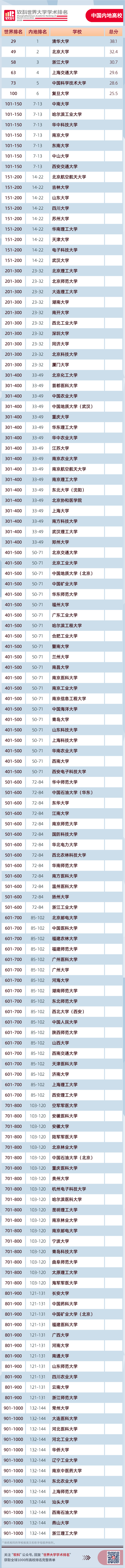 中国内地共有144所大学上榜,清华大学排名全球第29,北京大学名列第49,浙江大学和上海交通大学分别位居全球第58和第63,中国科学技术大学和复旦大学首次跻身全球百强,分别位列全球第73和第100。