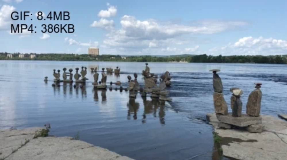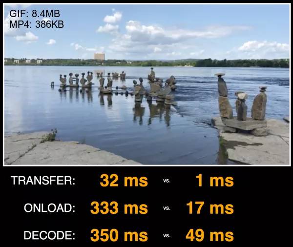 初步测试结果显示, <img> 标签中的 MP4 比同等条件下的 GIF 播放快 20 倍、解码快 7 倍——而文件尺寸仅为 1/14 !