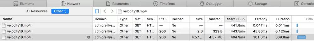 例如,速度峰会页面(Velocity conference page)上方的视频需要 5 秒才能加载,而他是此页面中的第 27 个加载项,是在 Start Render 请求之后,也在网页字体加载之后。
