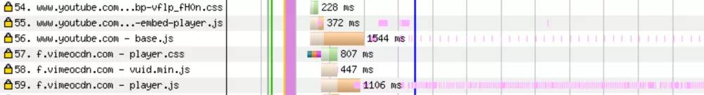 仔细看就能发现 JS 播放器在 DOM 完成之后立马请求了,但是很久之后才完全加载并开始播放视频。
