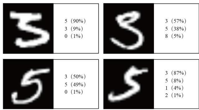 “2”被错误识别成“7”或“8”的情况大约占8%。虽然人能够轻松识别出图5 中的这些数字,神经网络却可能被某些特征给难住,比如“2”的小尾巴。有趣的是,神经网络对“3”和“5”也比较困惑(如图6 所示),识别错误的情况约占10%。