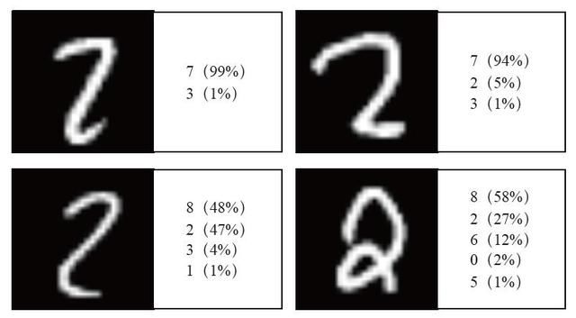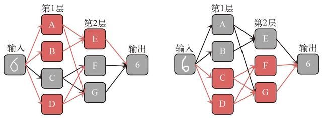 在图7 双层神经网络中,虽然输入是“6”的两幅不同形态的图像,但输出是一样的,并且该神经网络使用不同的神经元激活路径。尽管每一个神经元组合产生的预测是唯一的,但是每一个预测结果都可以由多个神经元组合实现。
