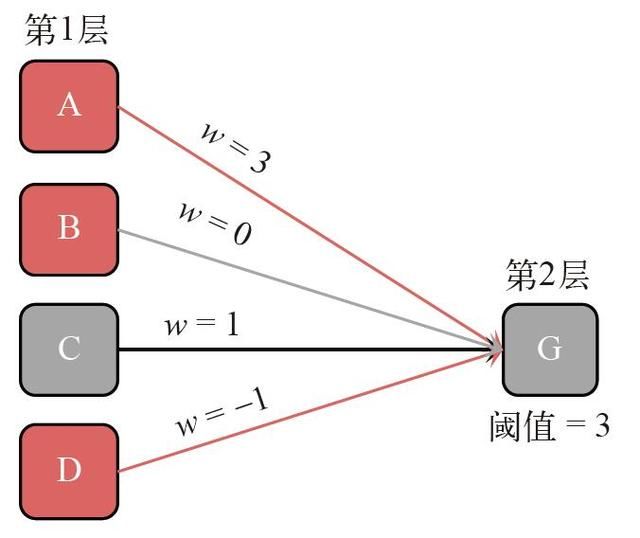 在计算神经元 G 的输入信号总强度时,把上一层与之有关联的所有激活神经元的权重加起来。如果信号强度大于指定的阈值,神经元 G 就会被激活。在图8 中,最终的信号强度为2(即3 – 1),由于神经元 G 的阈值为3,因此它仍然处于未激活状态。