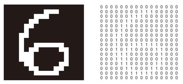 为了让计算机读取图像,必须先把图像转换成像素。黑色像素用 0 表示,白色像素用 1 表示,如图 3 所示。如果图像是彩色的,则可以使用三原色的色相值来表示。