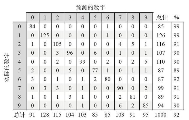 测试发现,神经网络从 1000 个新的手写数字中正确识别出了 922 个,即正确率达到了 92.2%。下图是一张列联表,可以用它来检查神经网络的识别情况。