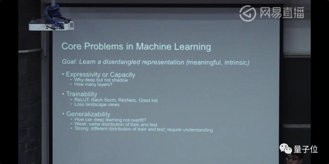 第三个问题是推广能力的问题,推广能力的问题又分成两类:弱推广能力和强推广能力。机器学习研究的基本问题是:训练数据和测试数据的统计是同分布的。弱推广能力是指,如果训练数据和测试数据不同分布,就不管了。强推广能力是指,真正理解了这件事情的表示,遇到新的训练数据集统计、分布和训练数据集,也可以去做。