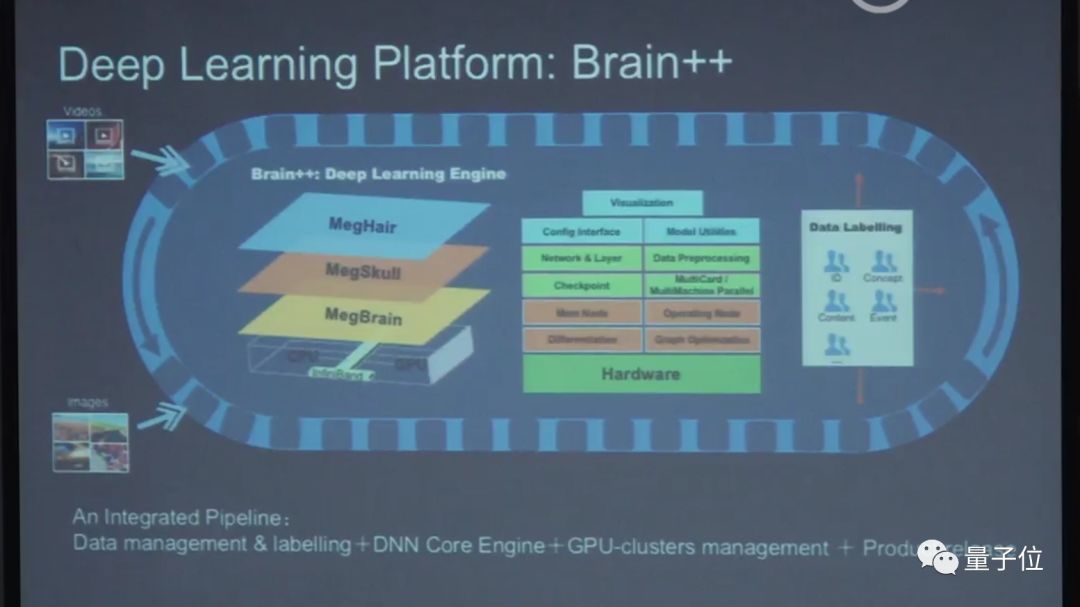 今天的GPU、CPU,不管在云上还是在端上带来很多变化,我们也很早就注意这方面的变化。Face++做了一个Brain++的一条系统,Brain++是指如果想训练神经网络,需要有一个GPU集群,然后需要有扩大的系统来管理这些软件,中间要有一个叫深度学习框架,比如TensorFlow,而我们做了一套叫Brain++,这是我们自己研制的深度学习框架。
