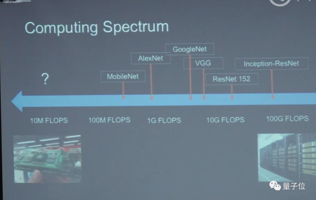 做了一个计算的轴,大家可以看中间是AlexNet,它的趋势是:越往右,清晰度越高,但是要求的网络计算复杂度越来越大;左边是低精度的,但是却是一个很大的需求。
