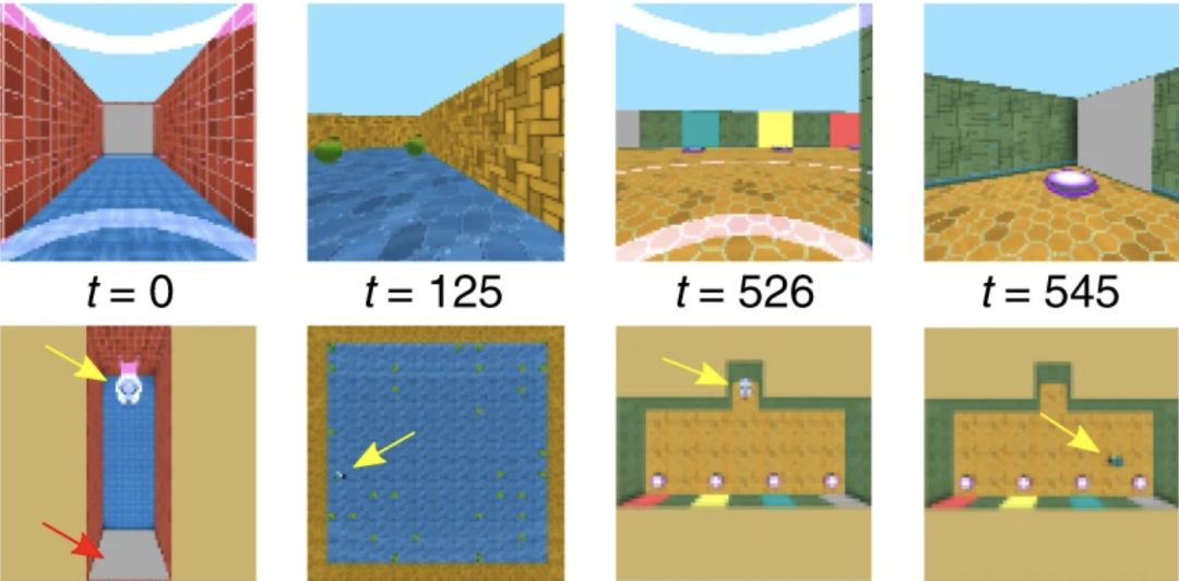 当应用于具有较大干扰奖励的Active Visual Match 任务时,具有TVT的RMA模型在P1阶段学习了正确的行为,甚至比没有干扰奖励的RMA更快。(图2 b, d)。学习行为的差异是戏剧性的:TVT可靠地找到了P1中的彩色方块,而RMA表现随机(图3)。