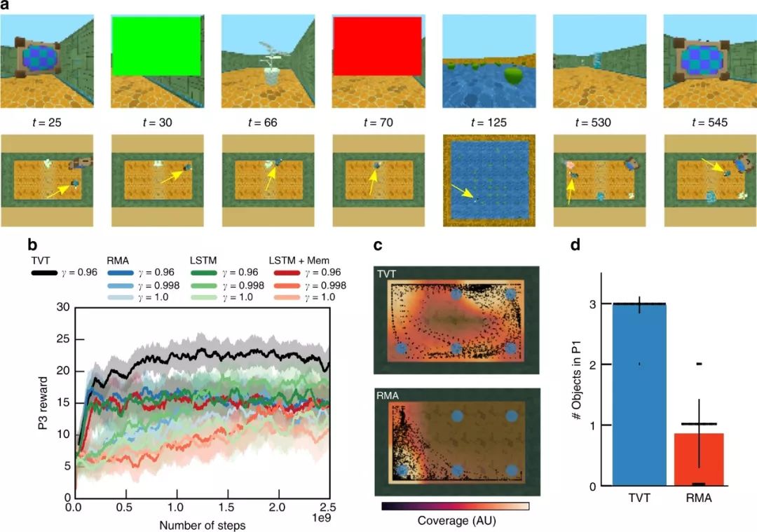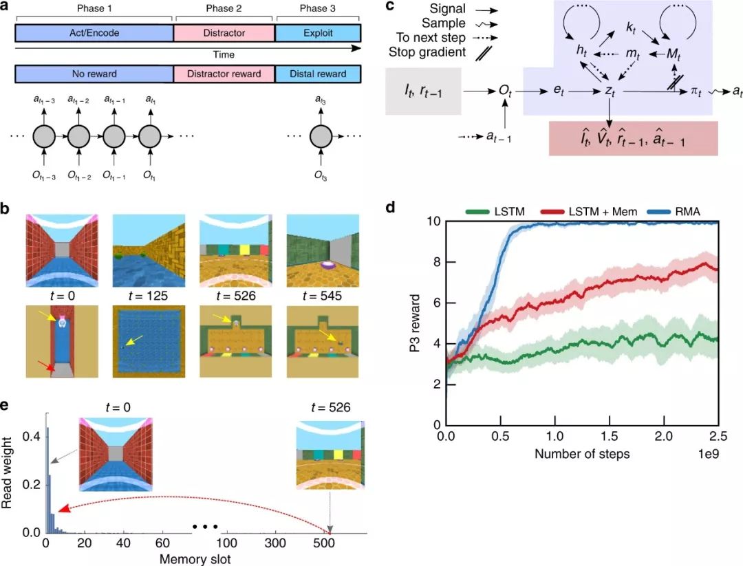 我们使用一个AI智能体来解决这个任务,将其命名为RMA(图1c),它是从以前的模型简化而来的。关键的是,这个模型结合了一个重建过程来压缩有用的感官信息和记忆存储,这些存储可以通过基于内容的寻址查询来通知agent的决策。RMA本身不具有支持LTCA的专门功能,但是为TVT算法的操作提供了基础。