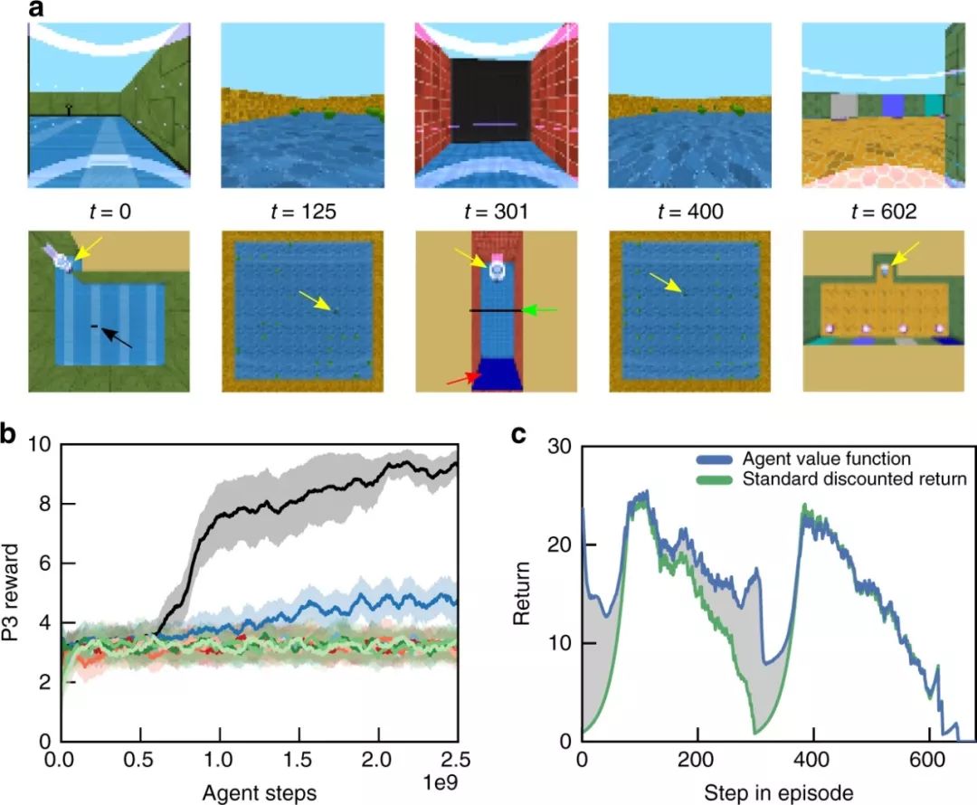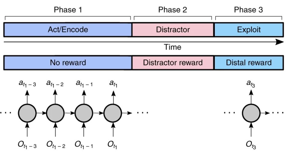 图1a:3阶段的任务结构。在P1,没有奖励,但是agent必须寻找信息或者触发事件。在P2,agent执行一个提供奖励的干扰任务。在P3, agent可以根据其在P1中的行为获得远端奖励。