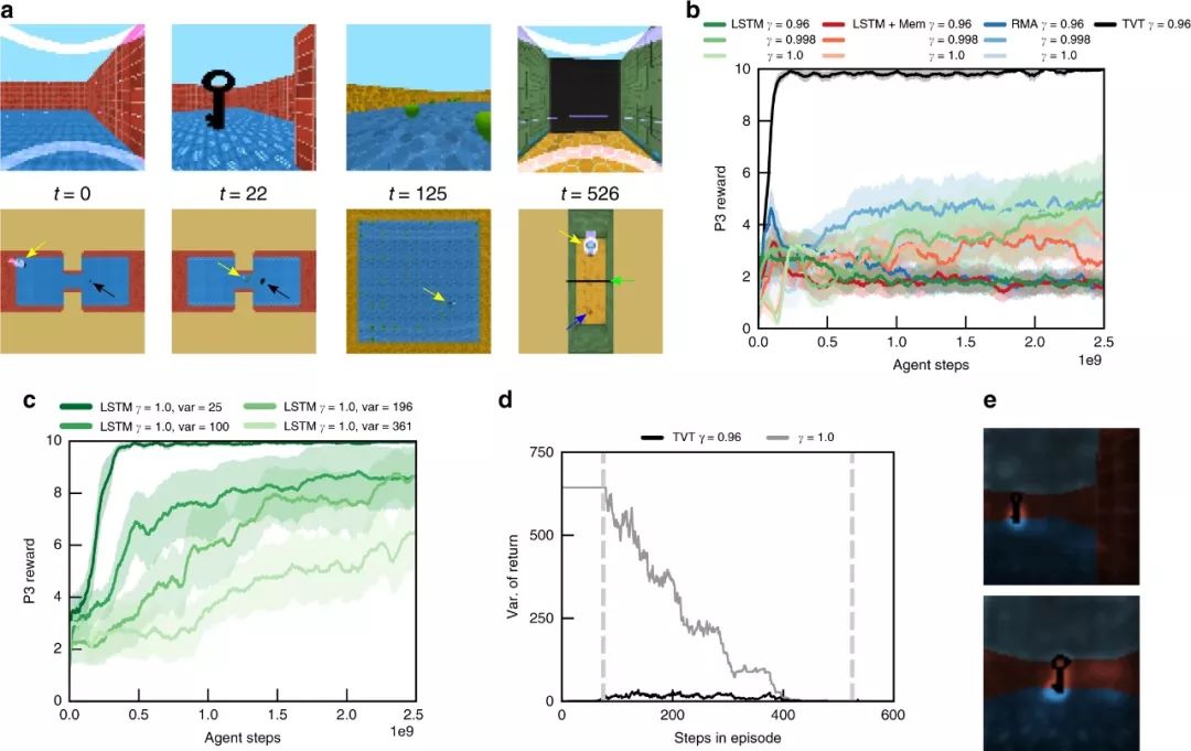 TVT agent单独完成了任务(图6b,黑色曲线),通常在P1中接触所有三个对象(图6d),而RMA平均只接触一个对象(图6b,其他颜色)。在P1中,对象被放置在6个可能位置的网格中(与P3位置无关)。只有TVT学习到一种探索性的扫描行为,可以有效地覆盖对象所在的位置(图6c);RMA移动到同一角落,因此意外地触及了一个物体。