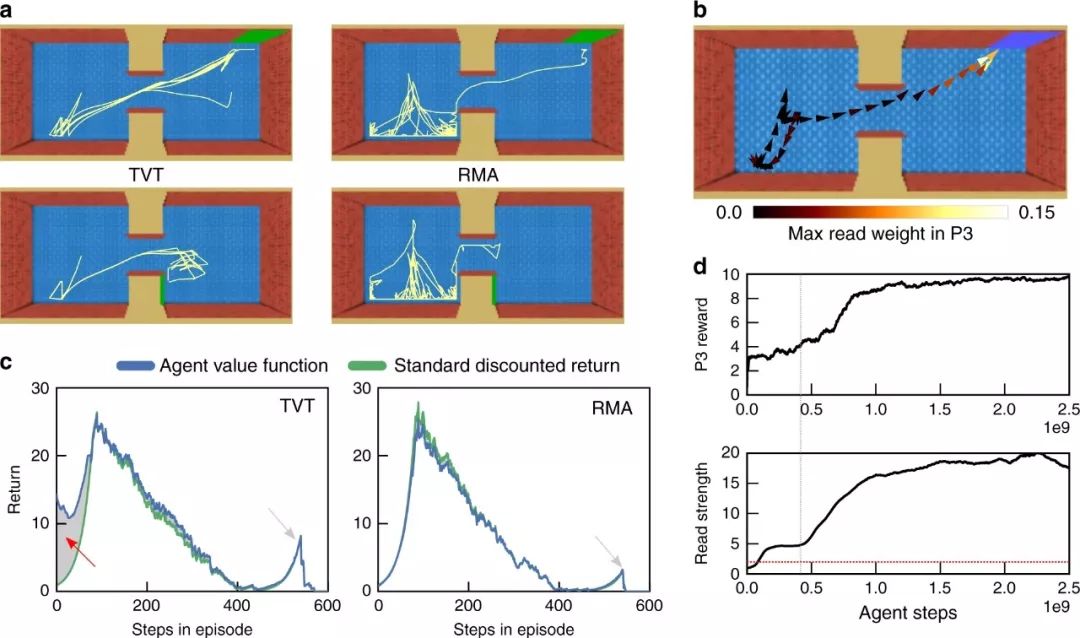 在图2c中,我们强调了TVT背后的基本原理。在之前的Passive Visual Match 任务中,我们看到RMA读取机制学会了从P1中检索记忆,以生成P3中的值函数预测和策略。