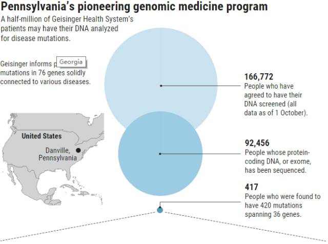 目前,由Geisinger Health System所主持实施的宾夕法尼亚州先驱基因组医学计划(Pennsylvania’s pioneering genomic medicine program)已经对92400人的编码DNA进行了测序,将166000人纳入了他们的研究。
