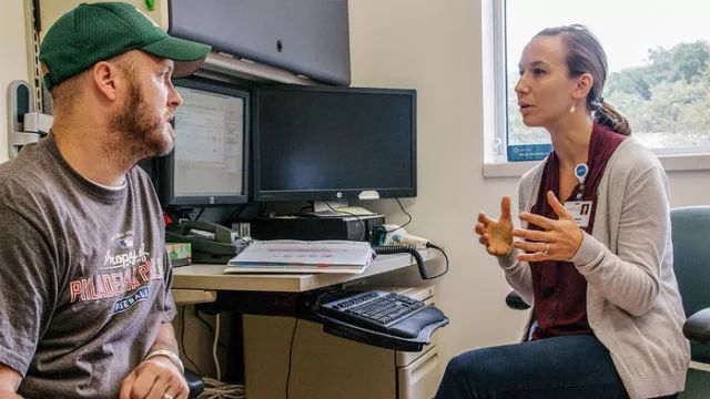 Geisinger医疗中心遗传咨询师Heather Rocha与病人Jeffrey Mowery在一起
