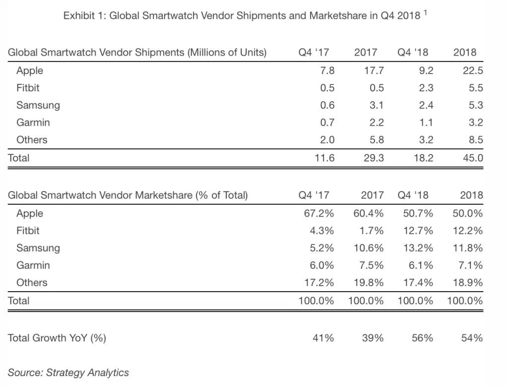 苹果的相对市场份额从2017年第四季度的67.2%下降到2018年第四季度的50.7%,因为三星和Fitbit的出货量几乎增长了两倍。据Strategy Analytics的说法,这一变化来自新款Galaxy手表的日益普及,并会由经济实惠的新款Galaxy Watch Active维持,而Fitbit的Versa手表和Care健康平台正在推动其更多需求。