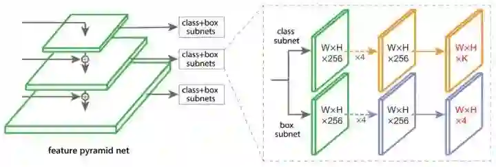 在RetinaNet的基础上,FSAF模块引入了2个额外的卷积层,这两个卷积层各自负责anchor-free分支的分类和回归预测。具体的,在分类子网络中,feature map后面跟着K个3x3的卷积层和sigmoid,在回归子网络中,feature map后面跟着4个3x3的卷积层和ReLU。