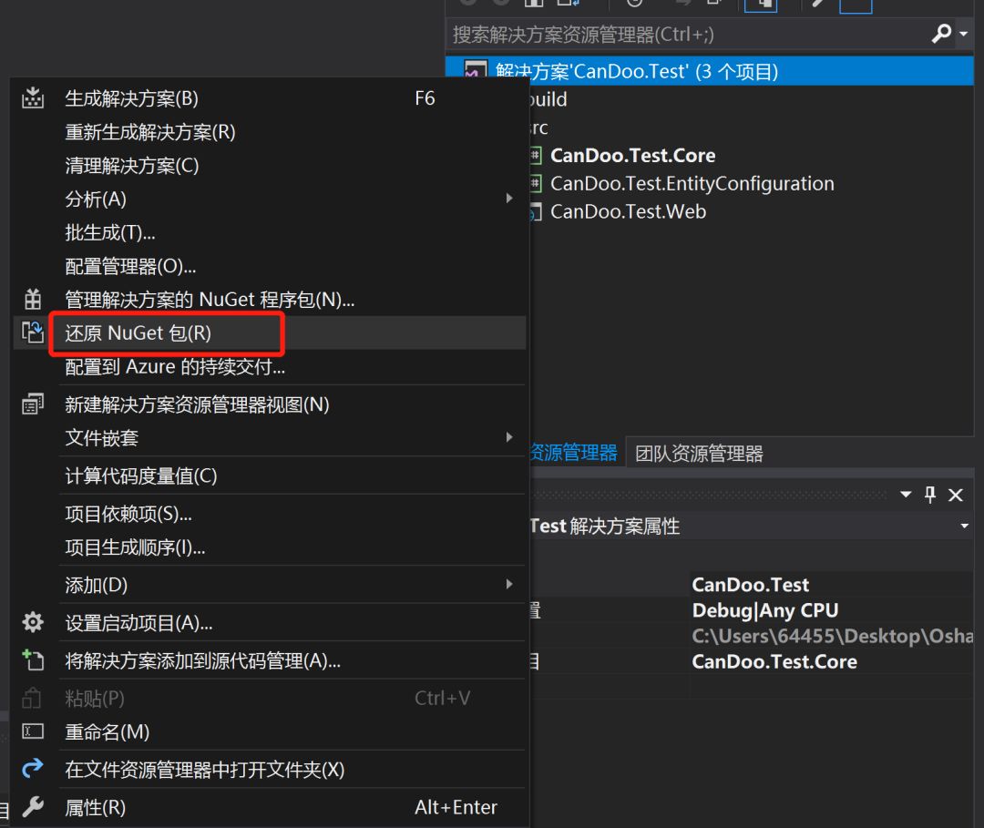2、在解决方案上,右击,点击还原Nuget包,完成相关引用的还原