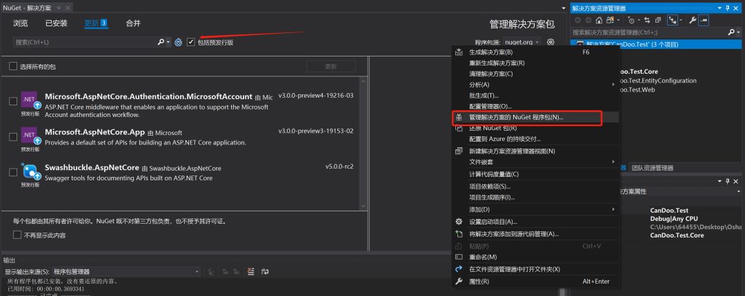 补充说明:OsharpNS正在大力完善中,更新比较快,如果需要更新OsharpNS的引用,请点击在解决方案上,右击,点击管理解决方案的Nuget程序包...,切换到更新标签,勾选包括预发行版(因为OsharpNS处于预发行状态,只更新Osharp相关的即可,其他的预发行的包别去用)