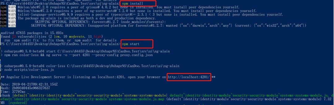 6、包安装完成后,输入项目启动命令npm start,如果运行成功,在浏览器中输入http://localhost:4201/就能看到界面了
