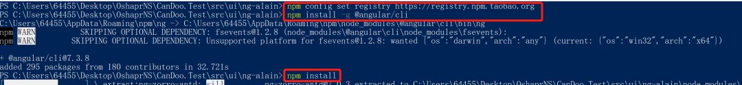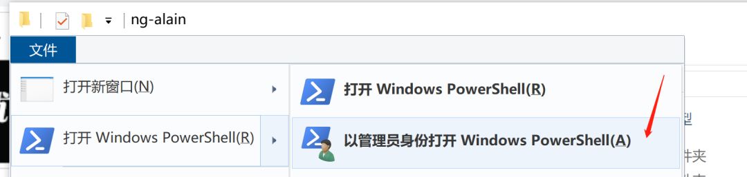 2、进入前端目录CanDoo.Test\src\ui\ng-alain,以管理员身份打开PowerShell