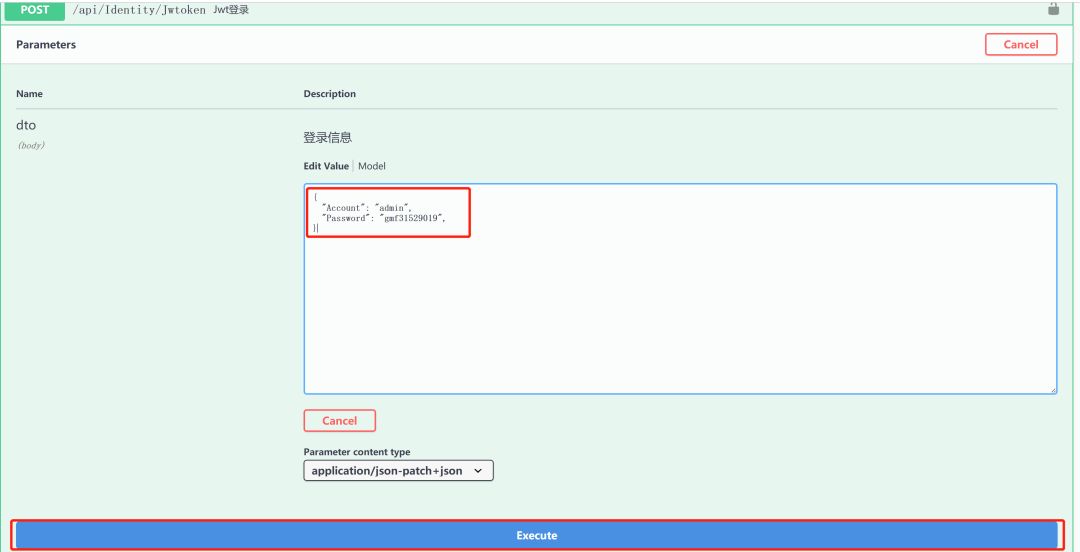 5、点击Try it out,输入用户名和密码,再点击Excute调用接口